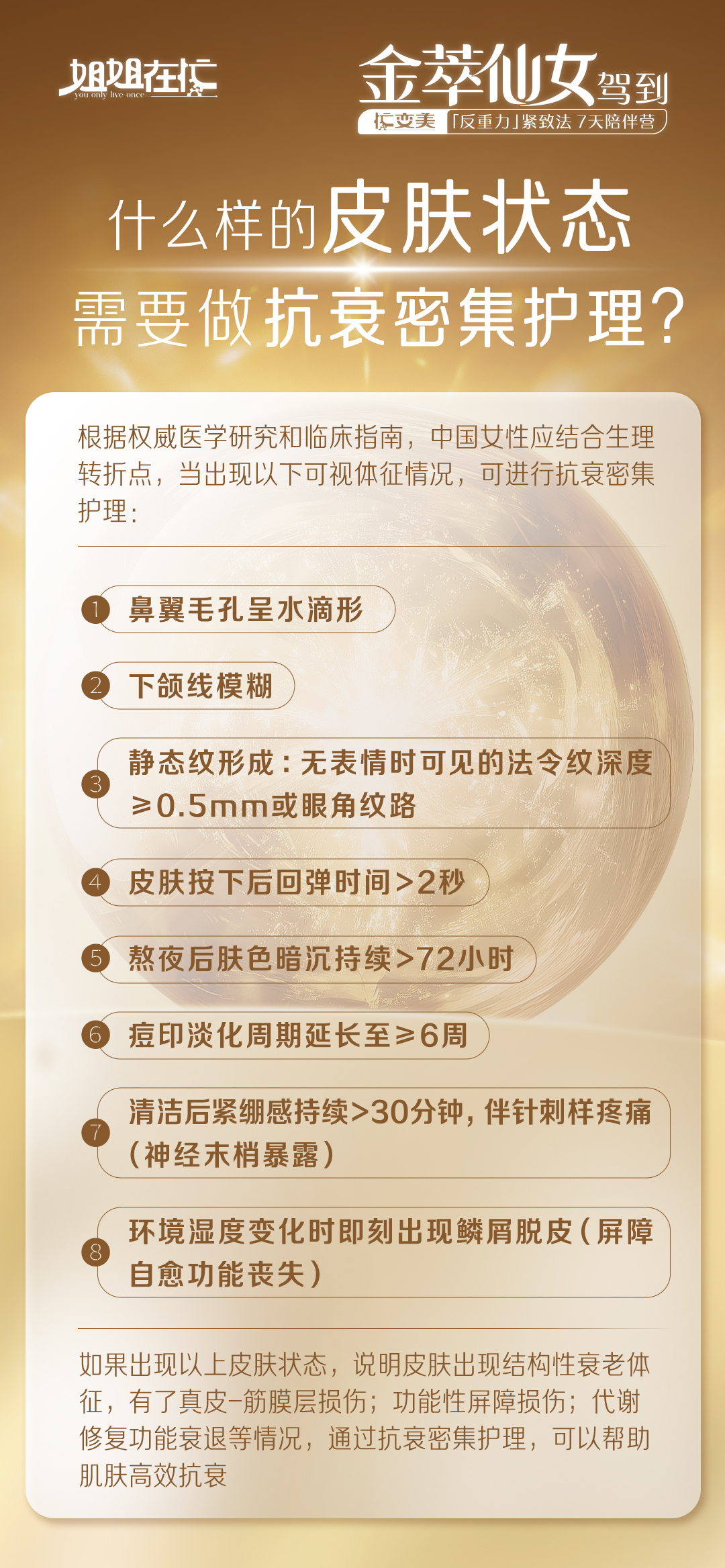 根据权威医学研究和临床指南,中国女性应结合生理转折点,当出现以下可视体征情况,可进行抗衰密集护理:
