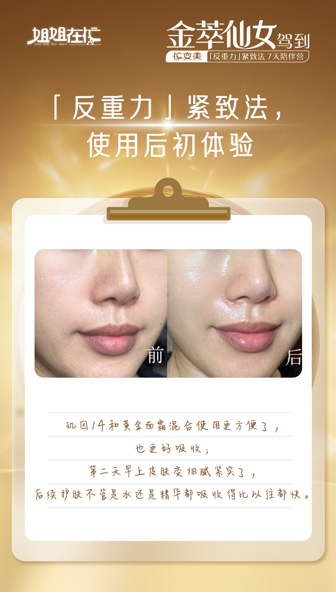大家都知道抗衰是个长期的事儿,但是谁说不能“弯道超车”呢,对于想更快加强抗衰效果的姐妹们,这个「反重力」紧致法特别适合,通过外抵抗内修复的细胞级抗衰密集护理,高效逆龄。这个紧致法总共有14天,咱们云陪伴7天,剩下7天大家就可以自己护理了~