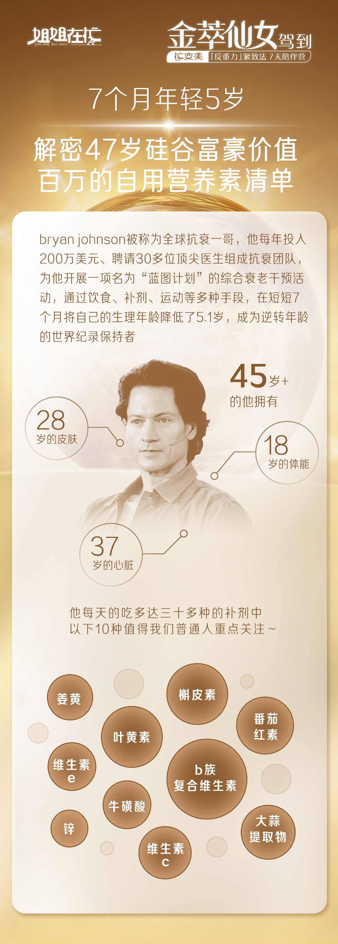 接下来,这是一份价值百万的硅谷富豪自用抗衰营养素清单哦,来自全球抗衰一哥——硅谷亿万富翁bryan johnson的自用抗衰团队为他定制每天必吃营养素