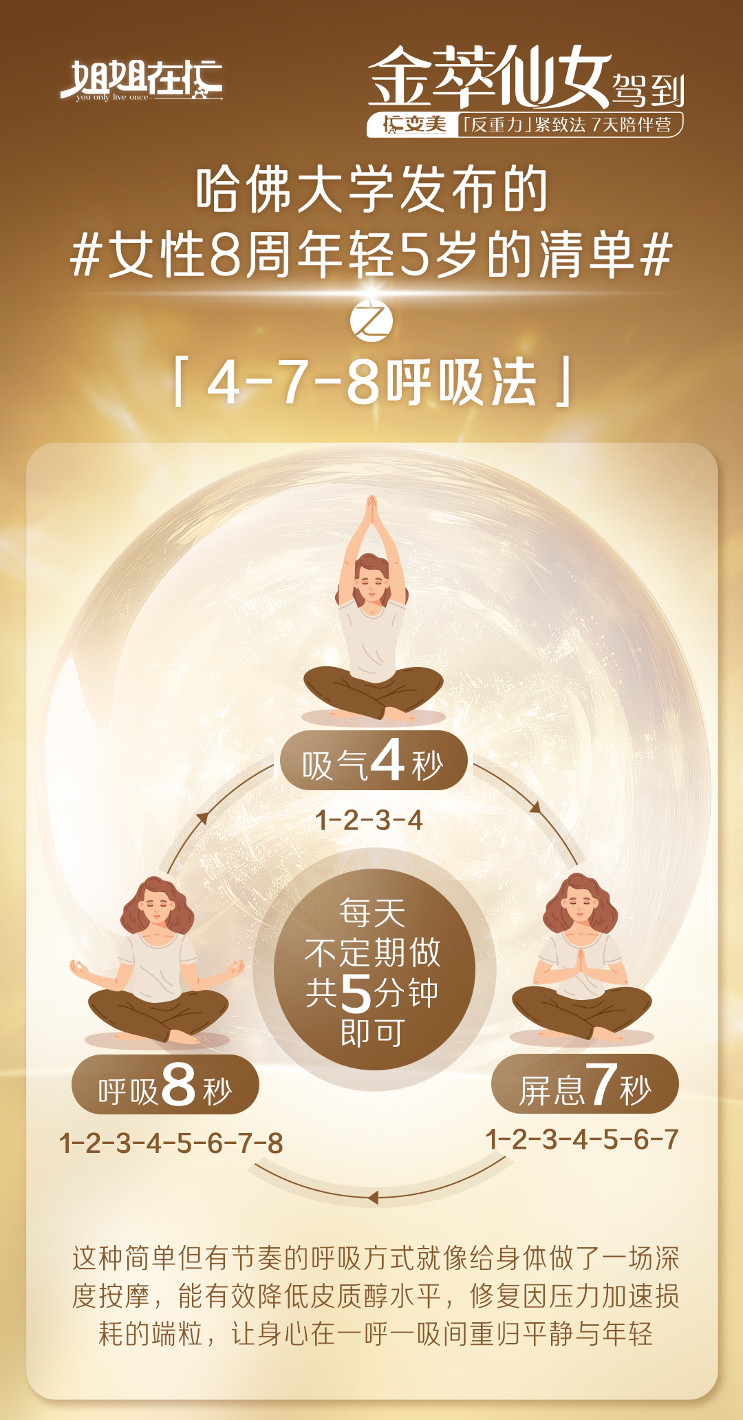 这种简单但有节奏的呼吸方式就像给身体做了一场深度按摩,能有效降低皮质醇水平,修复因压力加速损耗的端粒,让身心在一呼一吸间重归平静与年轻