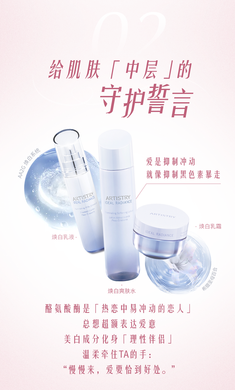 酪氨酸酶是「热恋中易冲动的恋人」总想超额表达爱意,美白成分化身「理性伴侣」温柔牵住TA的手:“慢慢来,爱要恰到好处。”