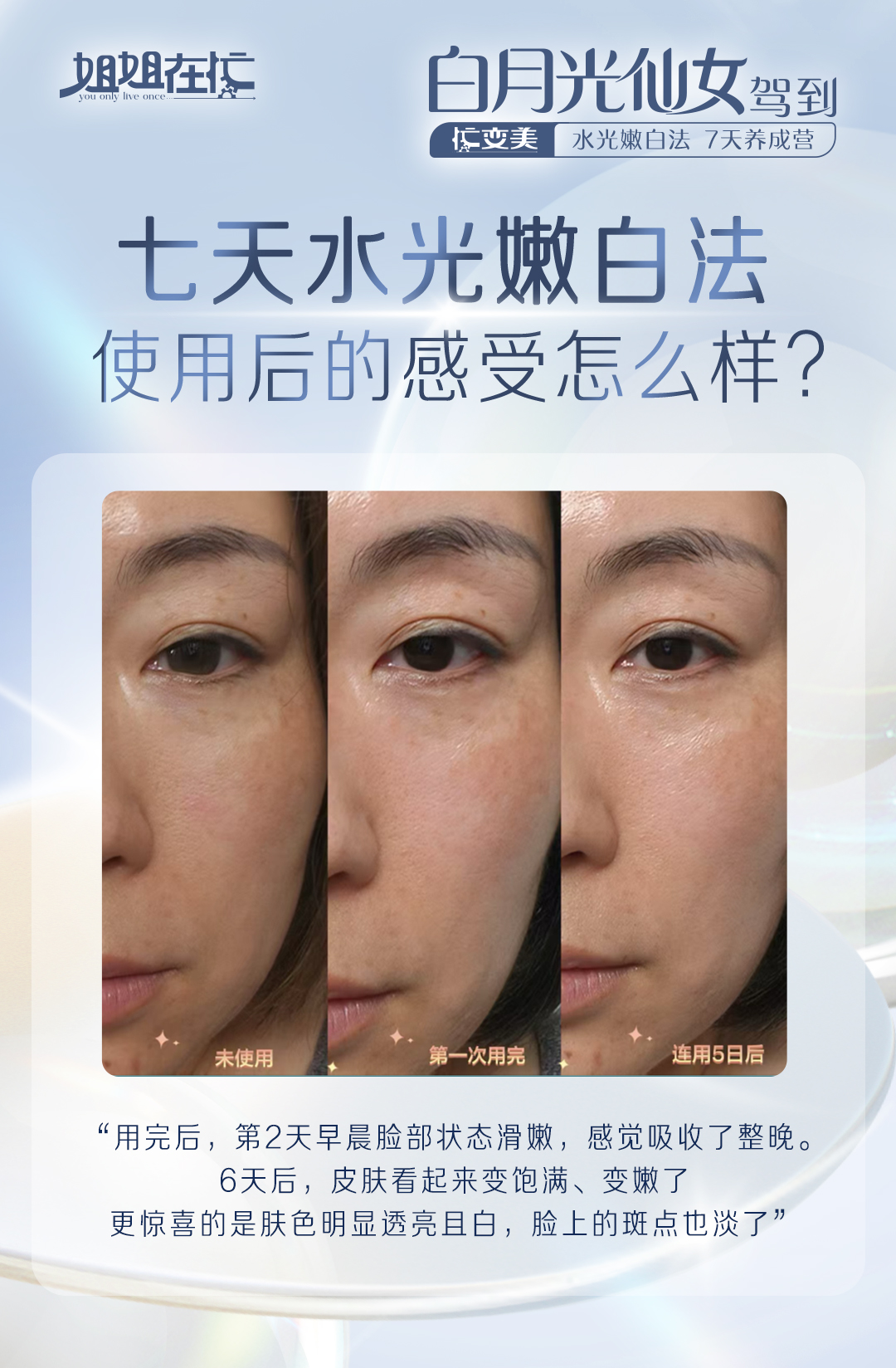 “用完后,第2天早晨脸部状态滑嫩,感觉吸收了整晚。6天后,皮肤看起来变饱满、变嫩了更惊喜的是肤色明显透亮且白,脸上的斑点也淡了”