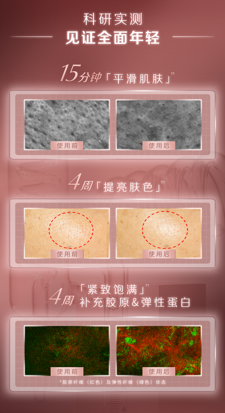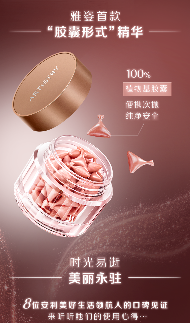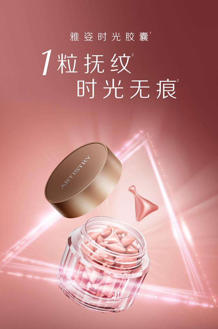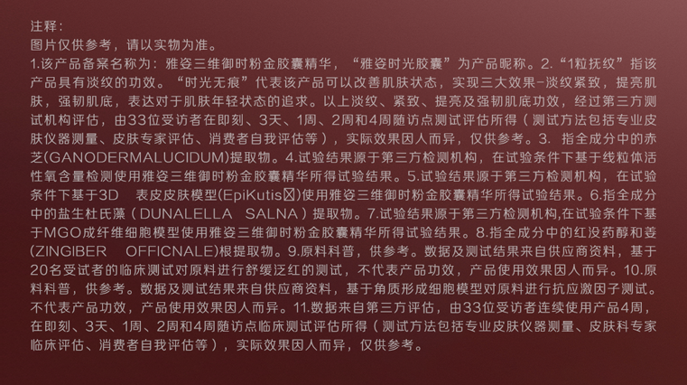 该产品备案名称为:雅姿三维御时粉金胶囊精华,“雅姿时光胶囊”为产品昵称。2.“1粒抚纹”指该产品具有淡纹的功效。“时光无痕”代表该产品可以改善肌肤状态,实现三大效果—淡纹紧致,提亮肌肤,强韧肌底,表达对于肌肤年轻状态的追求。以上淡纹、紧致、提亮及强韧肌底功效,经过第三方测试机构评估,由33位受访者在即刻、3天、1周、2周和4周随访点测试评估所得(测试方法包括专业皮肤仪器测量、皮肤专家评估、消费者自我评估等),实际效果因人而异,仅供参考。3. 指全成分中的赤芝(GANODERMALUCIDUM)提取物。4.试验结果源于第三方检测机构,在试验条件下基于线粒体活性氧含量检测使用雅姿三维御时粉金胶囊精华所得试验结果。5.试验结果源于第三方检测机构,在试验条件下基于3D 表皮皮肤模型(EpiKutis®)使用雅姿三维御时粉金胶囊精华所得试验结果。6.指全成分中的盐生杜氏藻(DUNALELLA SALINA)提取物。7.试验结果源于第三方检测机构,在试验条件下基于MGO成纤维细胞模型使用雅姿三维御时粉金胶囊精华所得试验结果。8.指全成分中的红没药醇和姜(ZINGIBER OFFICINALE)根提取物。9.原料科普,供参考。数据及测试结果来自供应商资料,基于20名受试者的临床测试对原料进行舒缓泛红的测试,不代表产品功效,产品使用效果因人而异。10.原料科普,供参考。数据及测试结果来自供应商资料,基于角质形成细胞模型对原料进行抗应激因子测试。不代表产品功效,产品使用效果因人而异。11.数据来自第三方评估,由33位受访者连续使用产品4周,在即刻、3天、1周、2周和4周随访点临床测试评估所得(测试方法包括专业皮肤仪器测量、皮肤科专家临床评估、消费者自我评估等),实际效果因人而异,仅供参考。