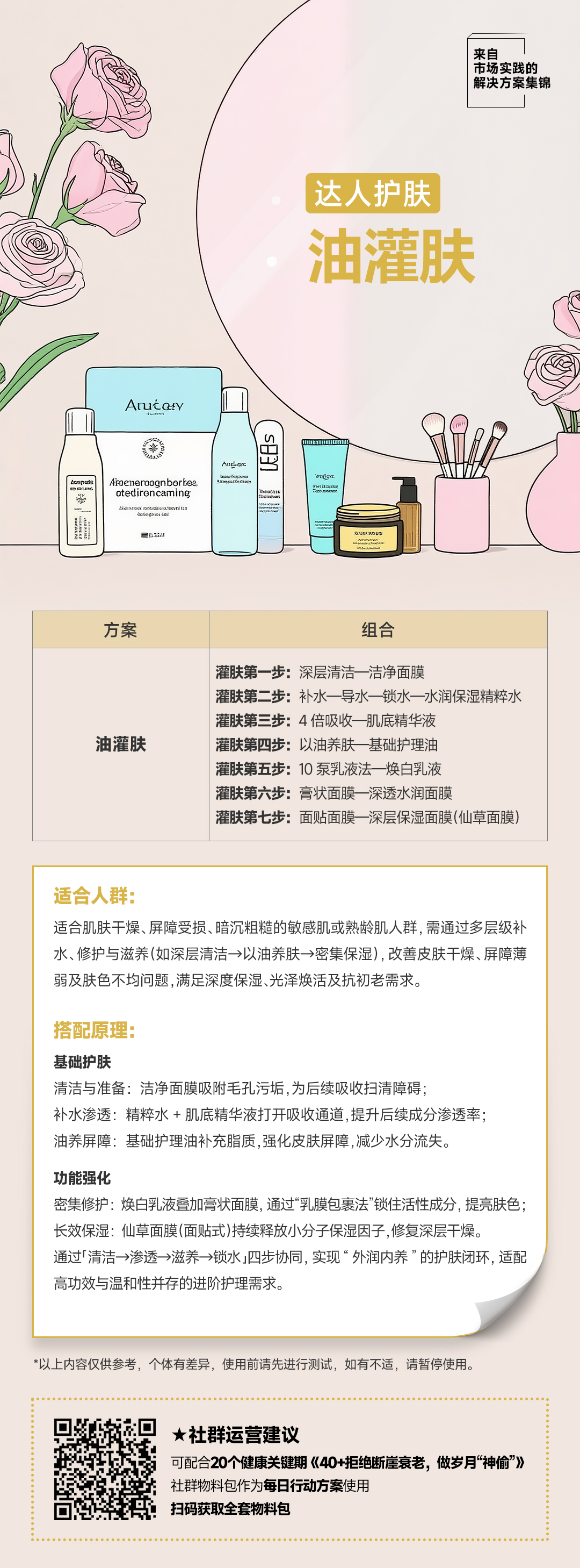 适合人群:适合肌肤干燥、屏障受损、暗沉粗糙的敏感肌或熟龄肌人群,需通过多层级补水、修护与滋养(如深层清洁→以油养肤→密集保湿),改善皮肤干燥、屏障薄弱及肤色不均问题,满足深度保湿、光泽焕发及抗初老需求。