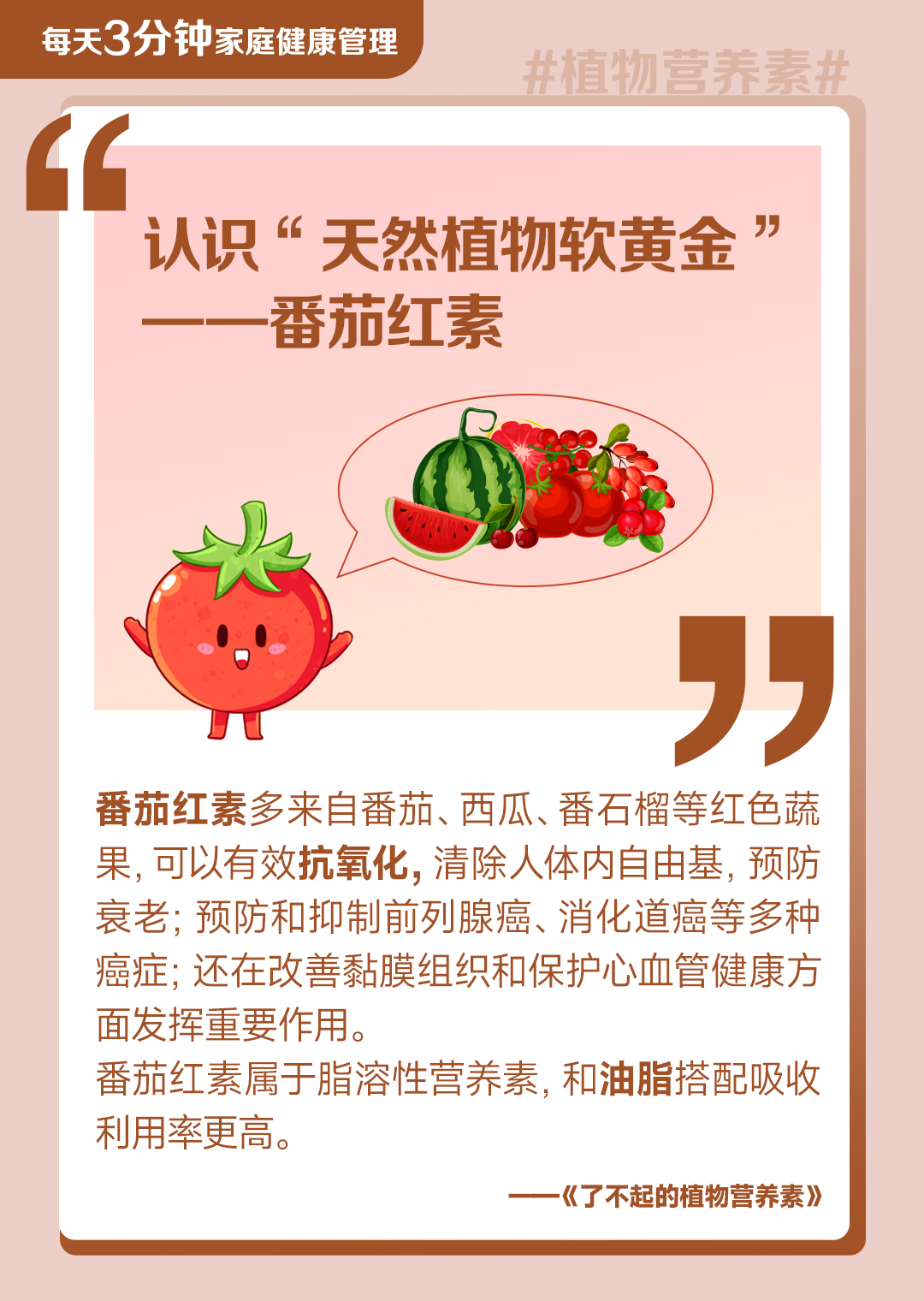 番茄红素多来自番茄、西瓜、番石榴等红色蔬果,可以有效抗氧化,清除人体内自由基,预防衰老;预防和抑制前列腺癌、消化道癌等多种癌症;还在改善黏膜组织和保护心血管健康方面发挥重要作用。