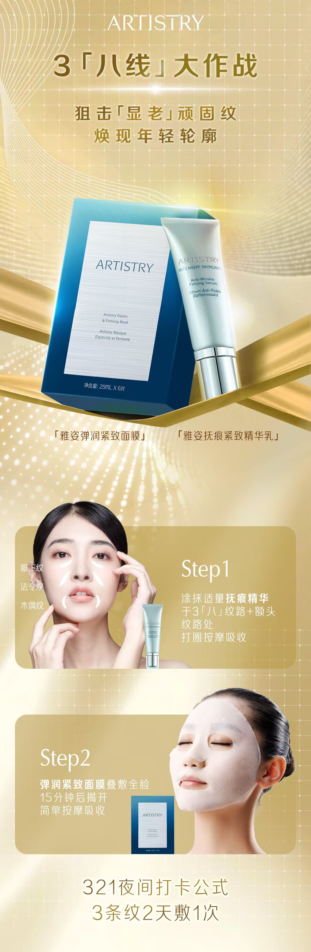晚上好呀~姐妹们,晚上是我们打造“皮肤内支撑力”的关键时刻。快快准备好你的雅姿抚痕紧致精华乳+雅姿弹润紧致面膜,一起跟练这套「3“八线”大作战护肤手法」吧~