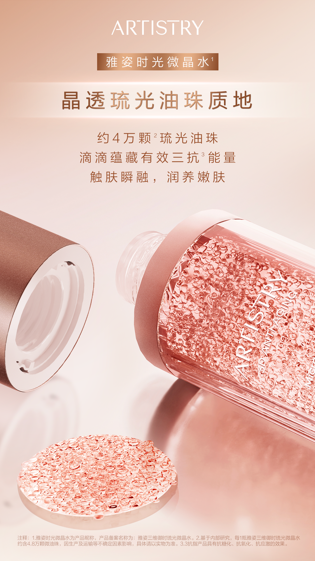 注释:1.雅姿时光微晶水为产品昵称,产品备案名称为:雅姿三维御时琉光微晶水。2,基于内部研究,每1瓶雅姿三维御时琉光微晶水约含4.8万颗微油珠,因生产及运输等不确定因素影响,具体请以实物为准。3.3抗指产品具有抗糖化、抗氧化、抗应激的效果。
