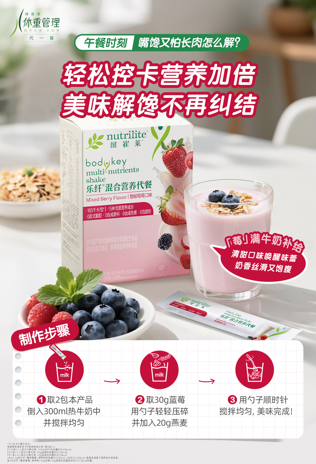 1包28.5g的乐纤「醇郁莓莓」营养粉+40g蓝莓+20g燕麦的热量增加约371kcal/份量。