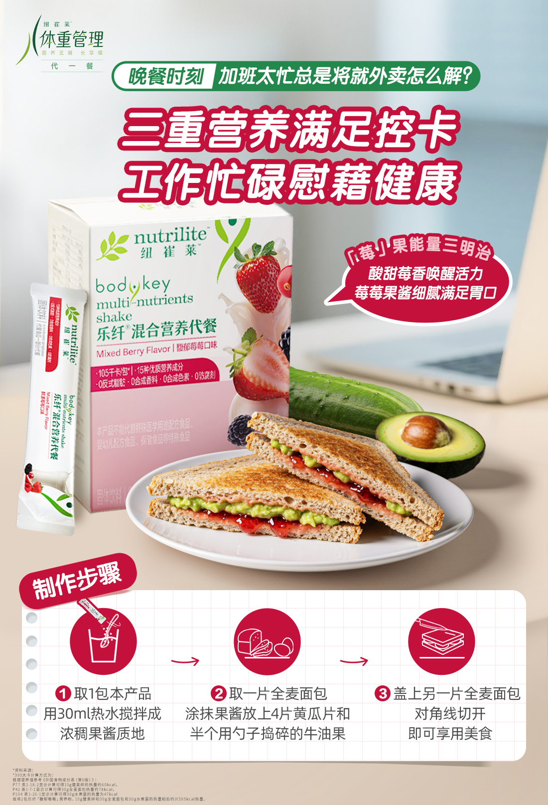 乐纤「馥郁莓莓」营养代餐+全麦面包+牛油果+黄瓜
