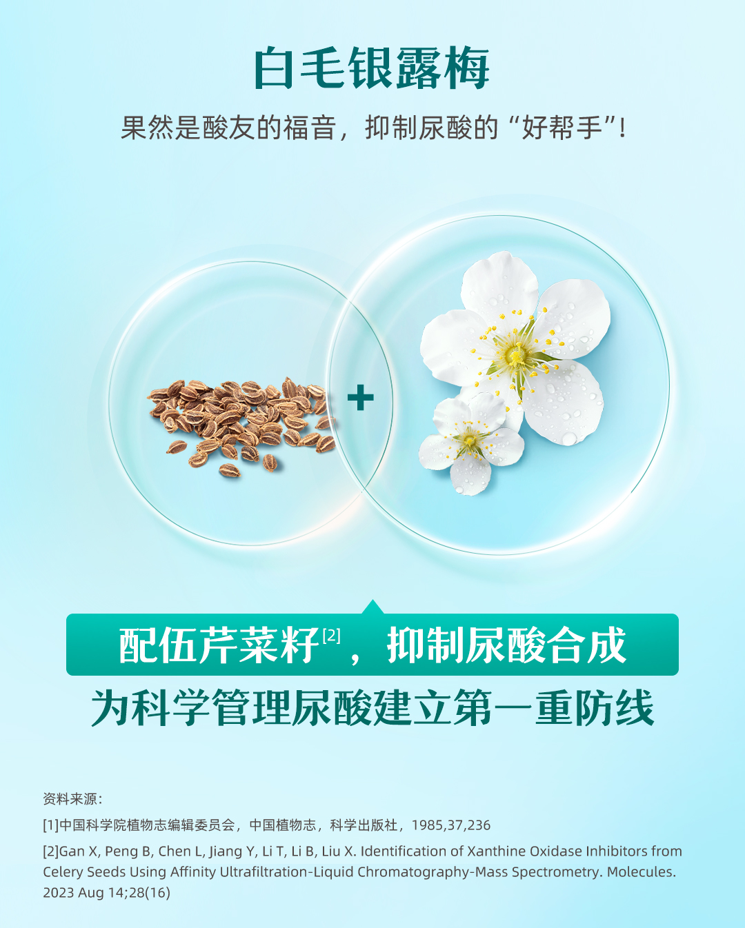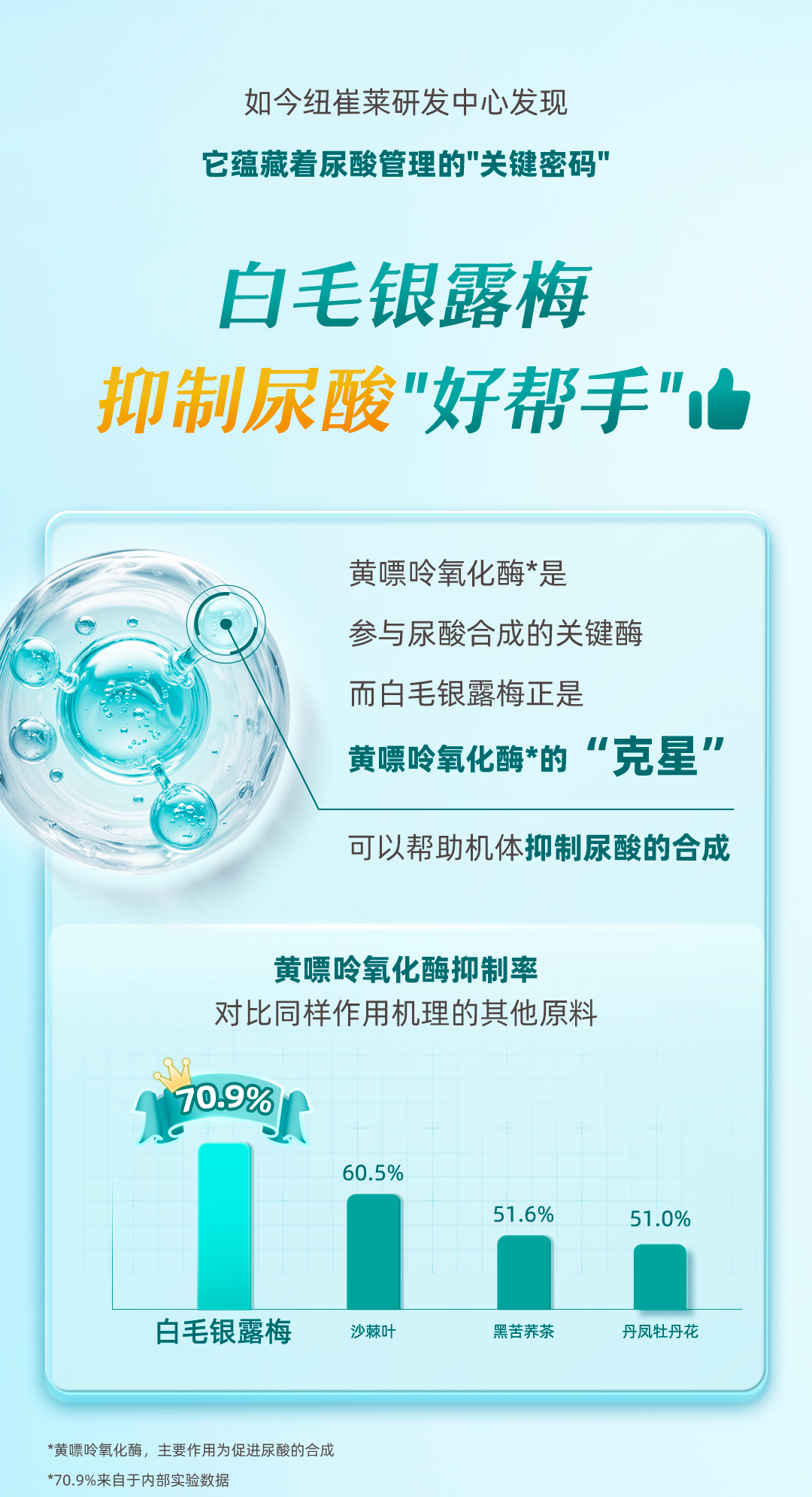 您知道吗?高冷的白毛银露梅各种水土不服,但也专治尿酸不服。众所周知,要从根源抑制尿酸合成,关键的搞定黄嘌呤氧化酶。纽崔莱研发中心专家发现,白毛银露梅提取物正是黄嘌呤氧化酶的克星,它能抑制黄嘌呤氧化酶活性率高达70.9%,效果远超其他原料。更厉害的是,当它遇上芹菜籽,简直就是王炸组合。从根源抑制尿酸合成。以后吃火锅海鲜大餐也不用这么提心吊胆了。江湖上还有一位排酸领跑员,荷叶。下集带您看看神秘的植研一号。