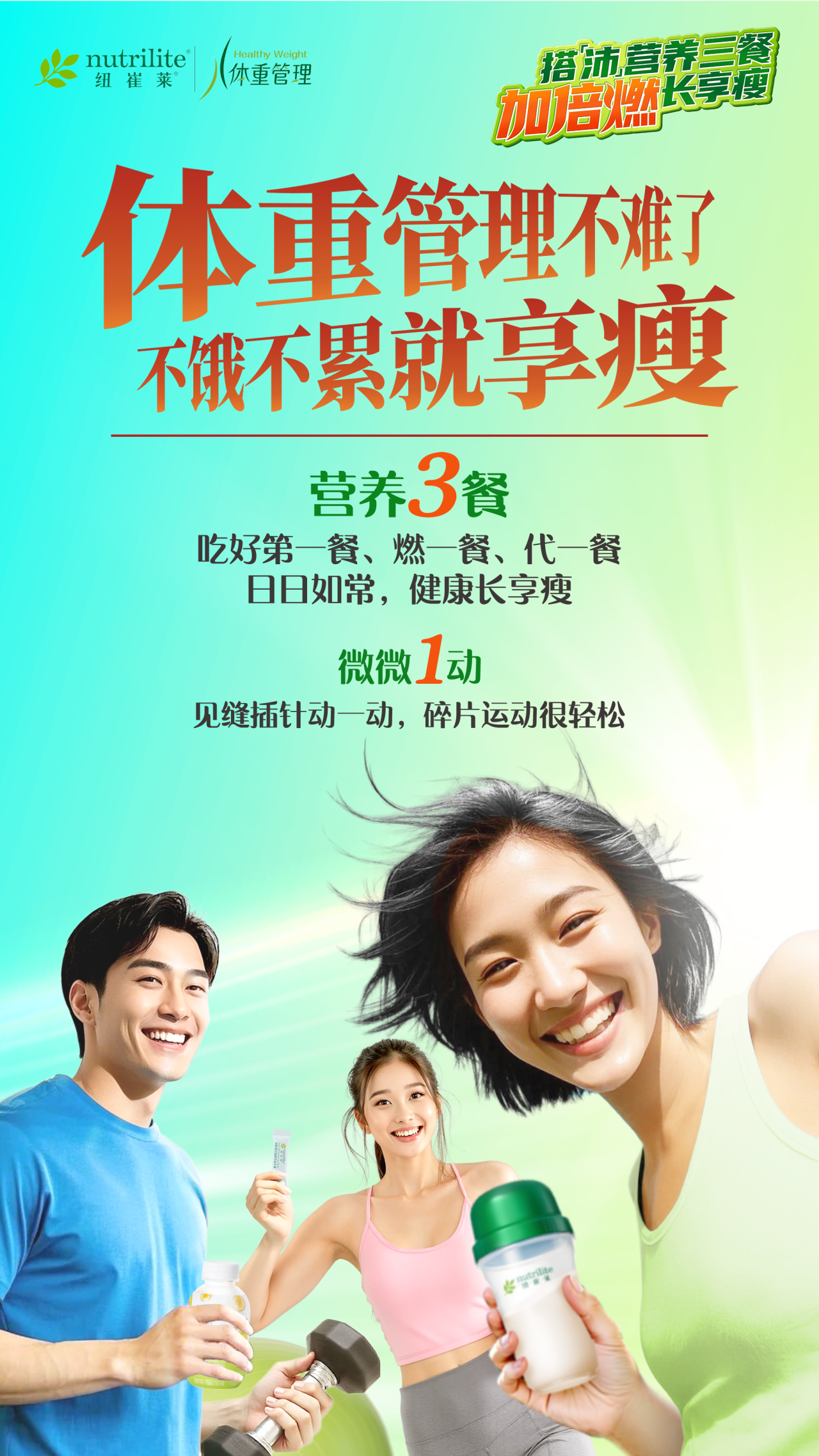 体重管理并不是心血来潮、一朝一夕的事情,而是一件能够慢慢融入生活、一生都需要做的事。或许目前您在体重管理的过程中还有一些痛点和难点,也无需焦虑,未来让纽崔莱陪您一起更加科学、安全、人性、有效的管好体重,轻松快乐“享瘦”!