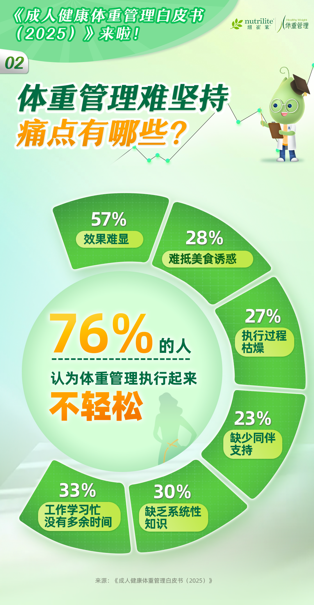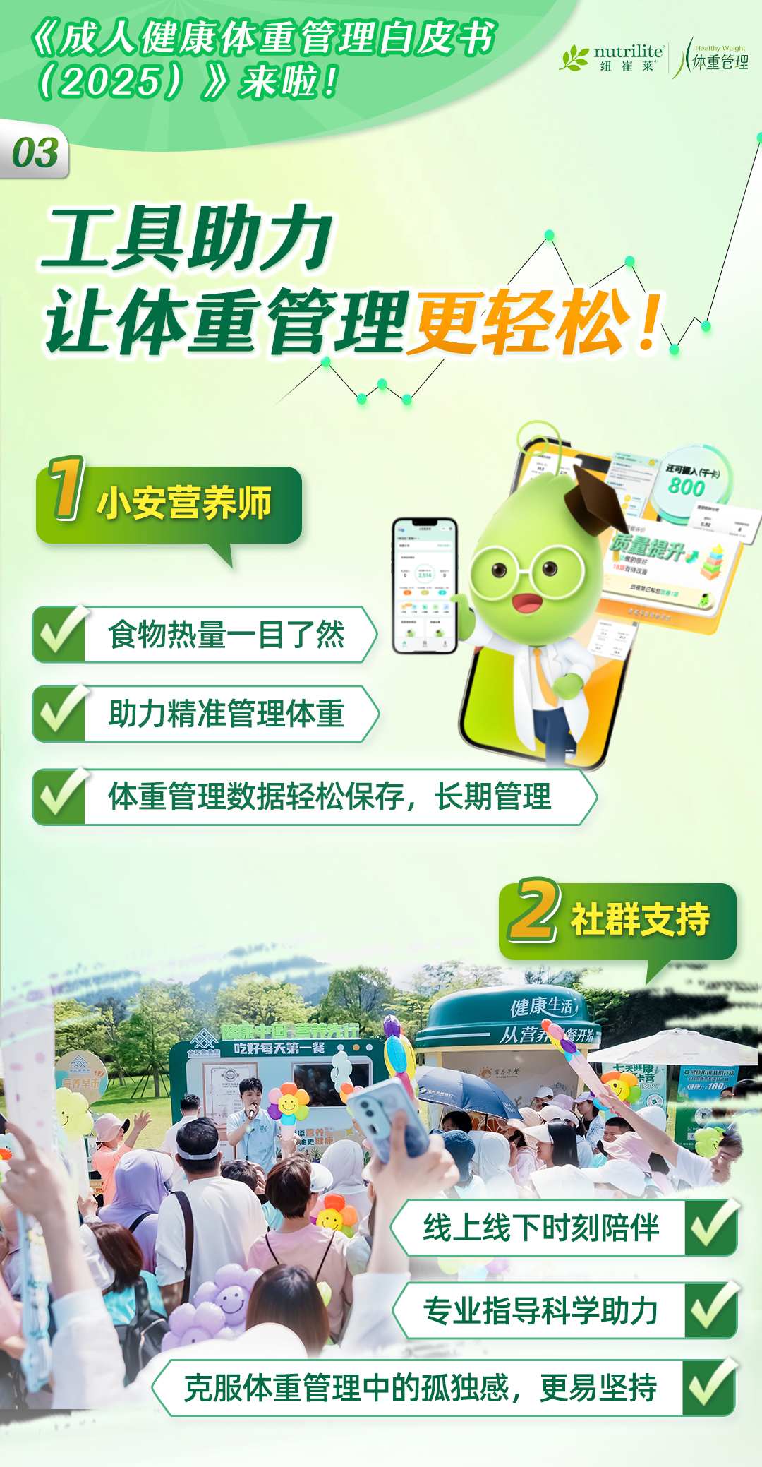 纽崔莱在体重管理领域深耕多年,快速响应国家号召。去年联合中华预防医学会推出了《健康体重,美好生活——成人体重管理科学建议20条》;今年继续联合中华预防医学会,以及暨南大学和全球知名市场调研公司益普索发布了《成人健康体重管理白皮书(2025)》。