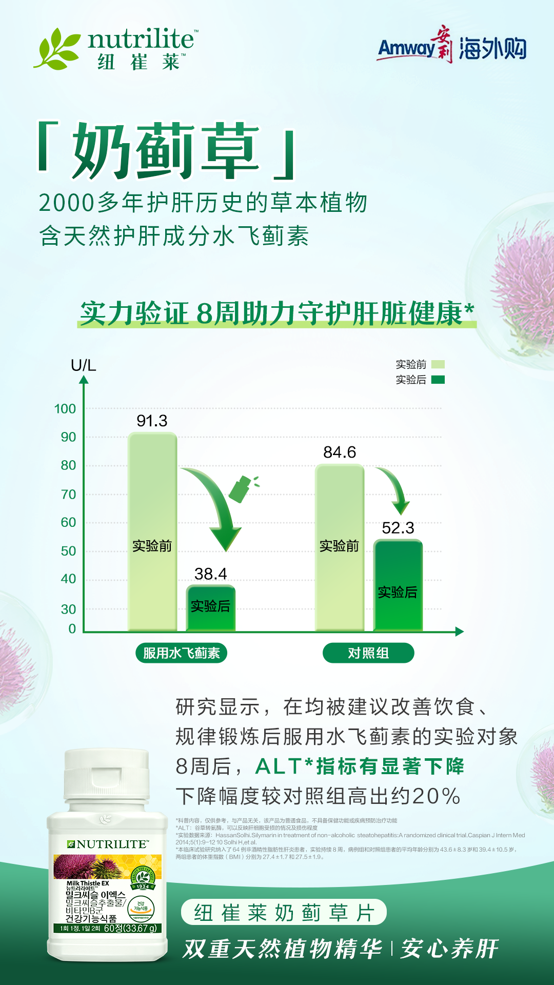 研究显示,在均被建议改善饮食、规律锻炼后服用水飞蓟素的实验对象8周后,ALT*指标有显著下降