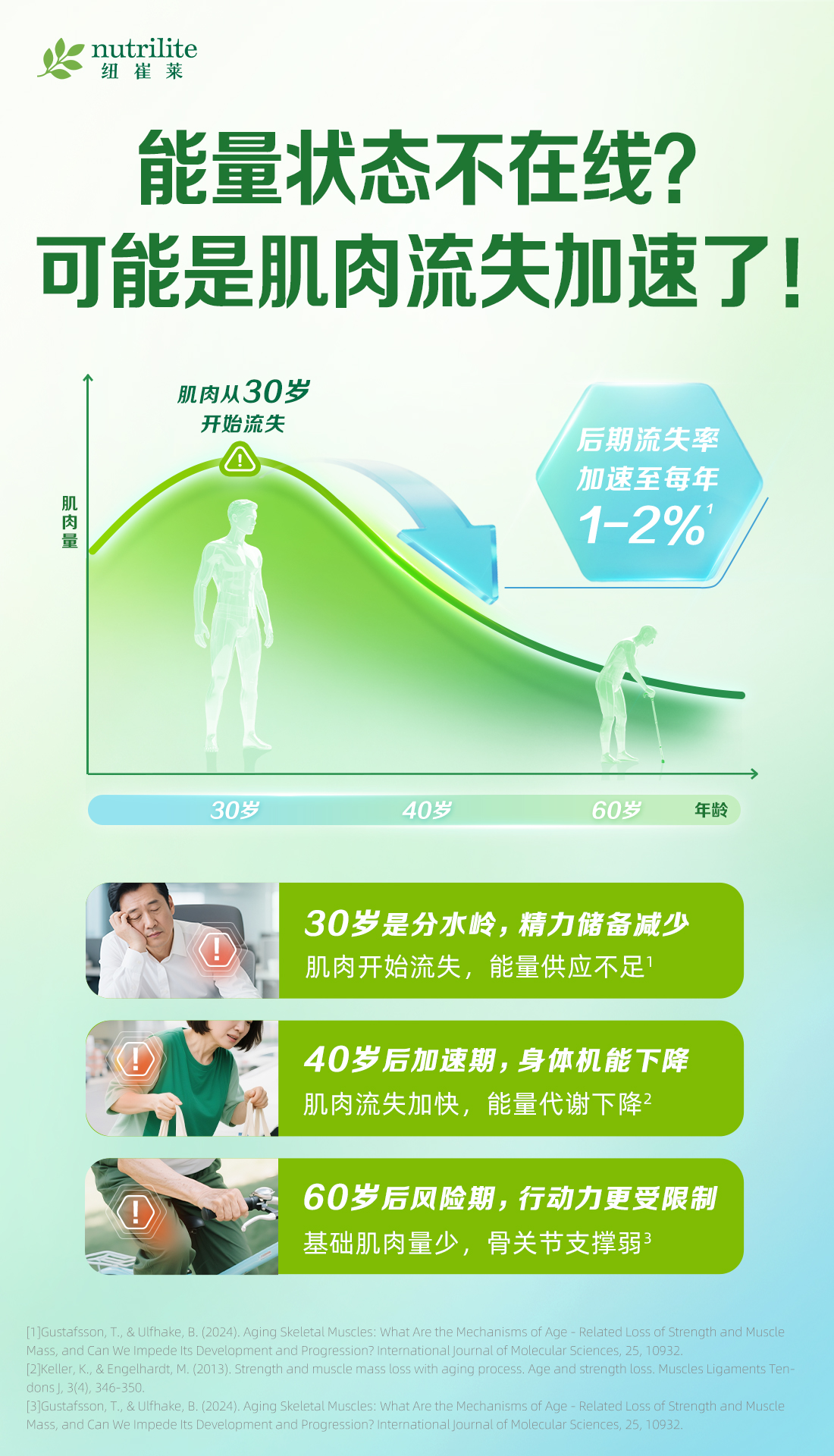 [3]Gustafsson, T., & Ulfhake, B. (2024). Aging Skeletal Muscles: What Are the Mechanisms of Age - Related Loss of Strength and Muscle Mass, and Can We Impede Its Development and Progression? International Journal of Molecular Sciences, 25, 10932.