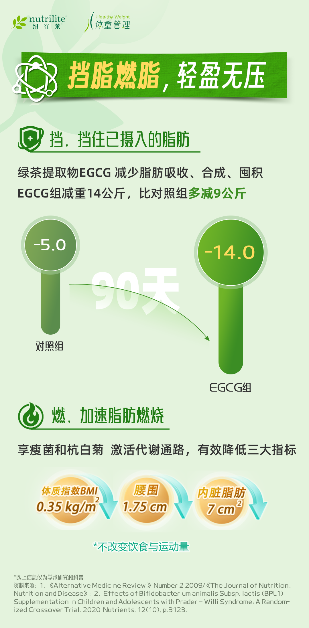 绿茶提取物EGCG 减少脂肪吸收、合成、囤积EGCG组减重14公斤,比对照组多减9公斤