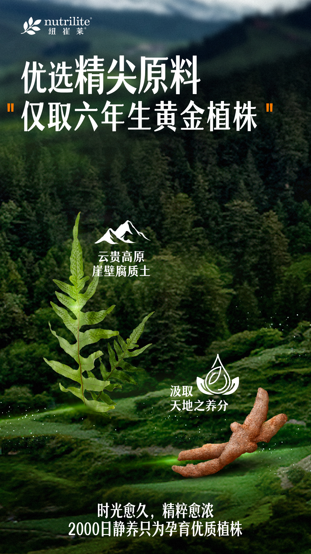 纽崔莱甄选云贵高原骨碎补原料,汲取天地养分,静守2000日孕育黄金精粹