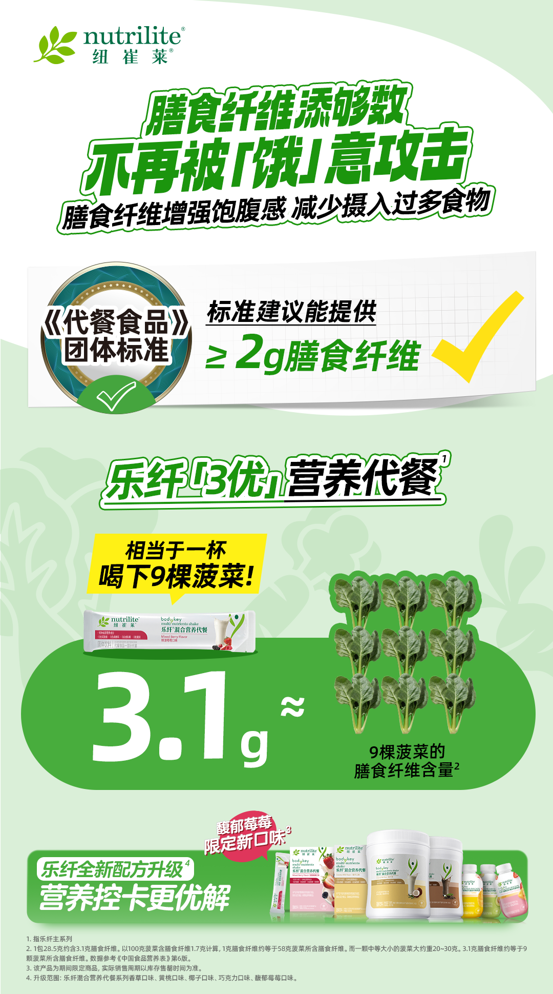 ✅乐纤「3优」营养代餐每份膳食纤维≥2g,相当于一杯喝下9棵菠菜!