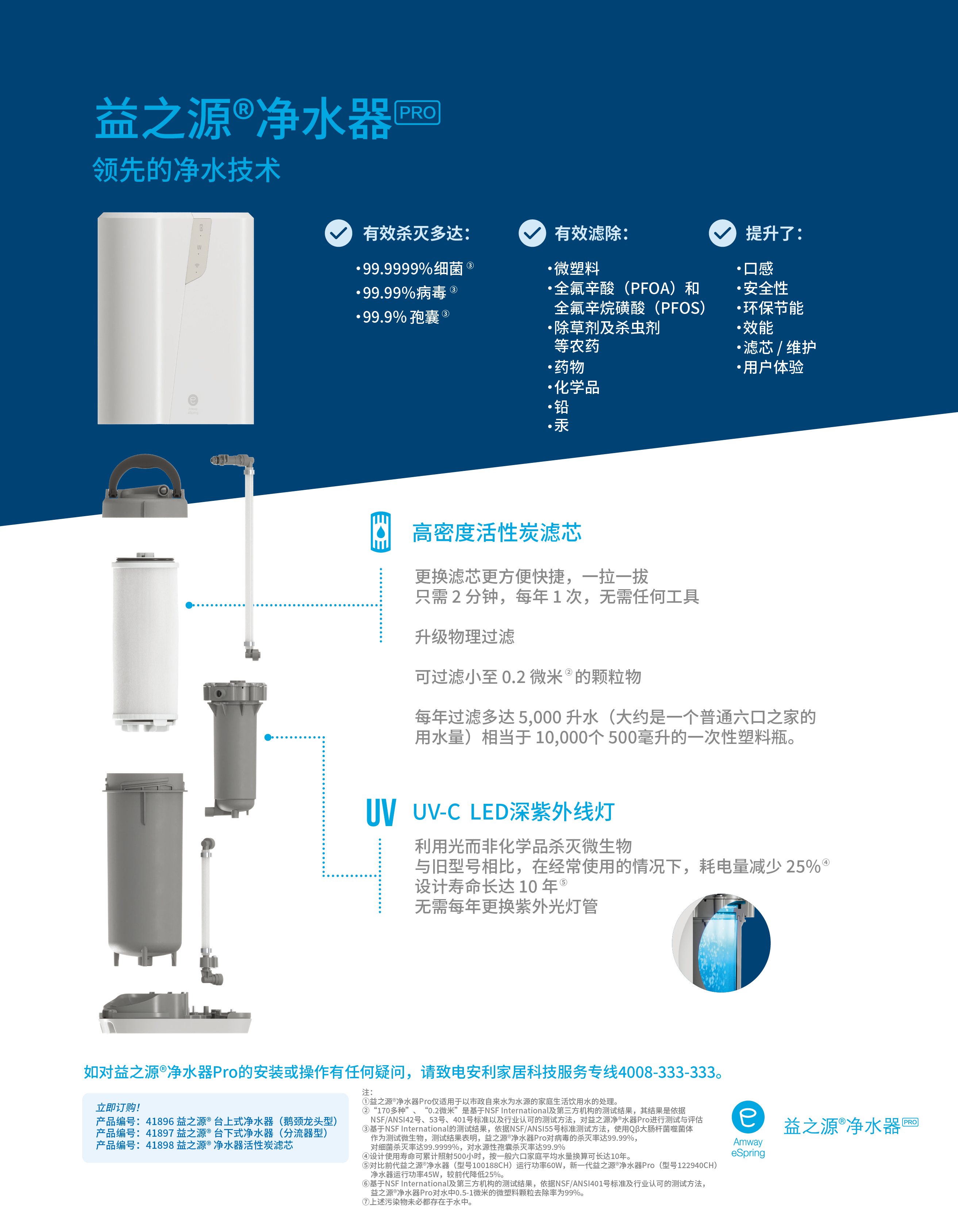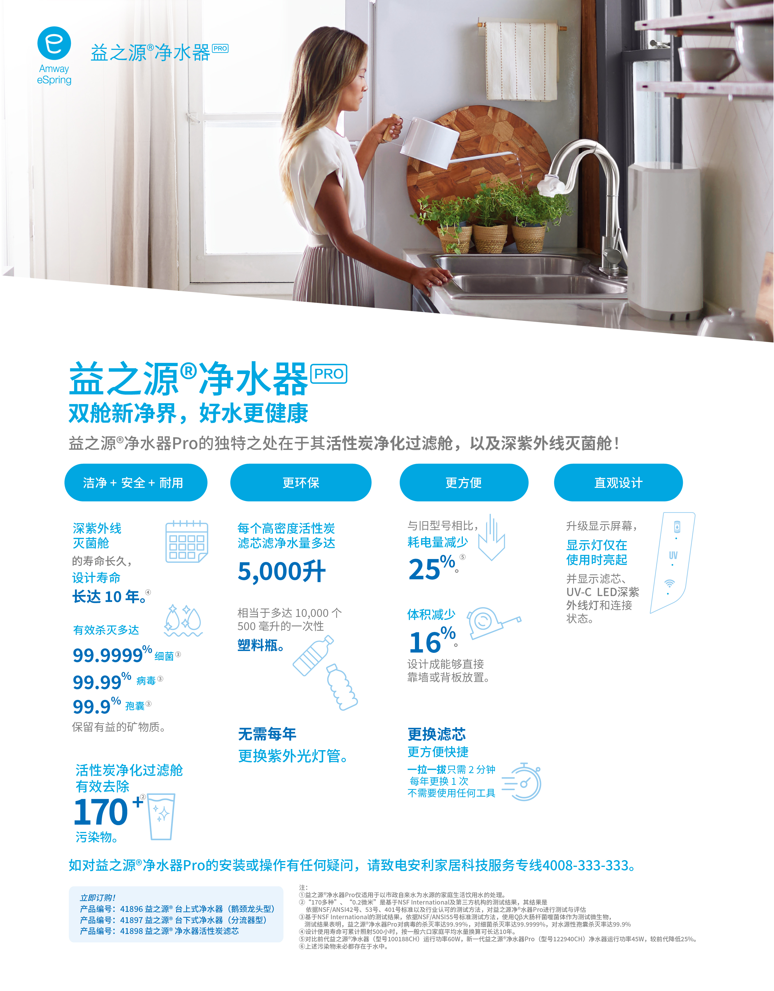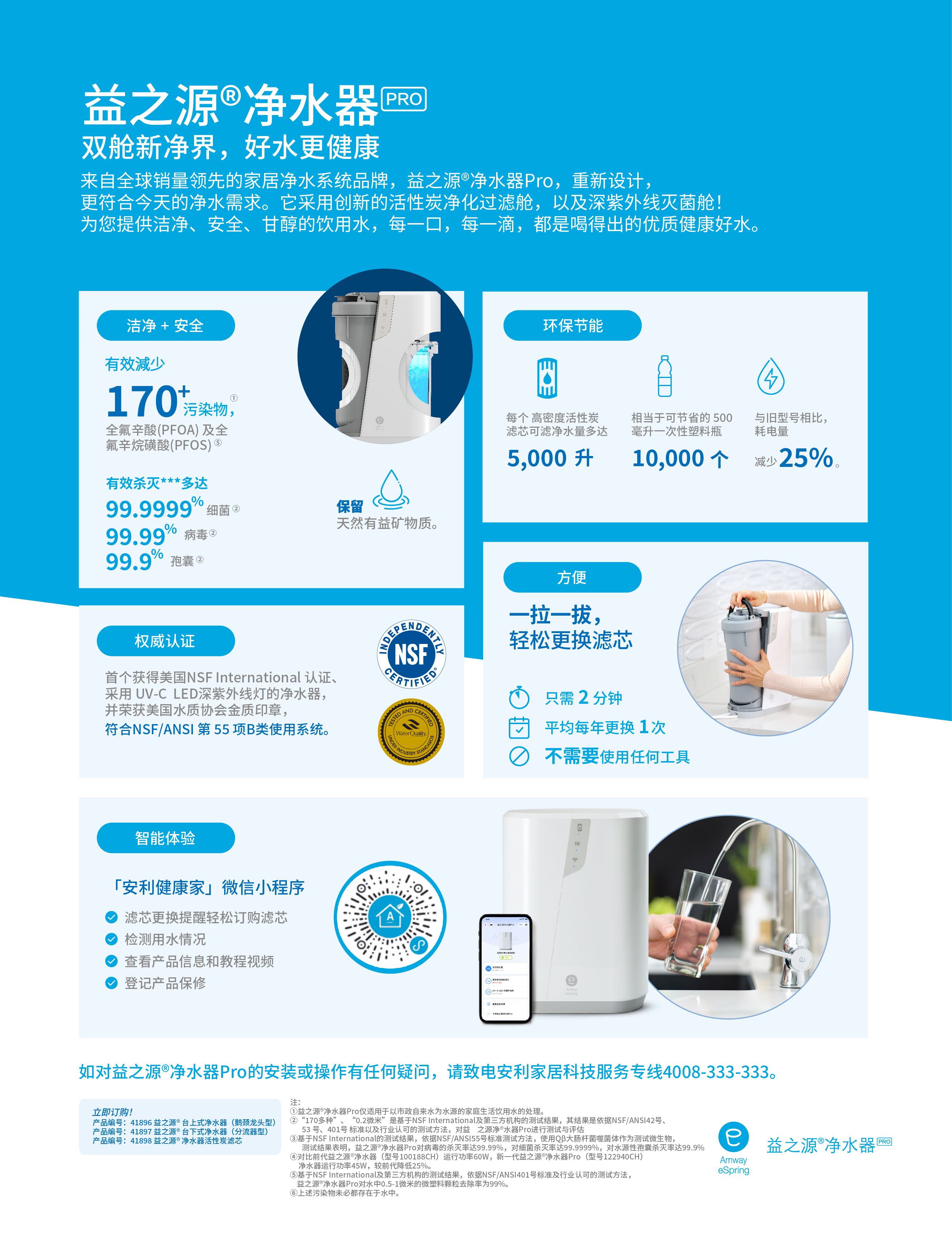 1 益之源®净水器Pro仅适用于以市政自来水为水源的家庭生活饮用水的处理。