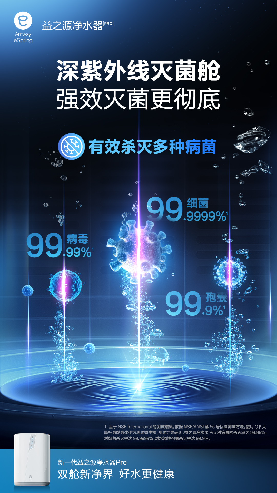 基于 NSF International 的测试结果,依据 NSF/ANSI 第 55 号标准测试方法,使用 Qβ 大肠杆菌噬菌体作为测试微生物,测试结果表明,益之源净水器 Pro 对病毒的杀灭率达 99.99%,对细菌杀灭率达 99.9999%,对水源性抱囊杀灭率达 99.9%。