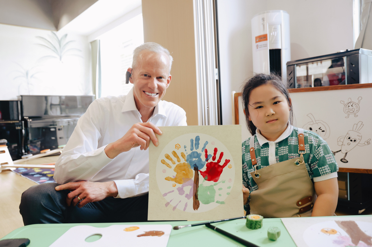 晨跑结束后,尼尔森总裁又专程来到“健康中国 我们行动”健康服务进社区活动现场,深入深圳高发社区,近距离感受安利健康志愿者扎根基层、服务居民的真实场景。社区里有AI智能科普机器人助手“小安”,通过趣味问答和健康常识推送,与居民做互动式科普;还有面向3-6岁孩子成长关键期的“儿童全面健康营养体系”活动,赋能社区打造孩子全面健康的成长环境。小朋友们用蘸了颜料的小手,印出一棵棵生机勃勃的大树,创作了一幅名叫“同绘美好”的画,送给尼尔森总裁。