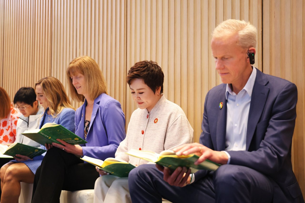 尼尔森总裁(右一)和安利(中国)总裁余放女士(右二)一起参与体验读书会社群活动