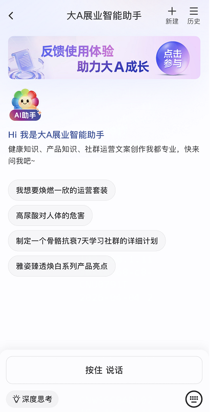 安利大A展业智能助手,可结合安利App超过3万条专业内容回答关于产品、健康、社群文案创作等方面的问题。