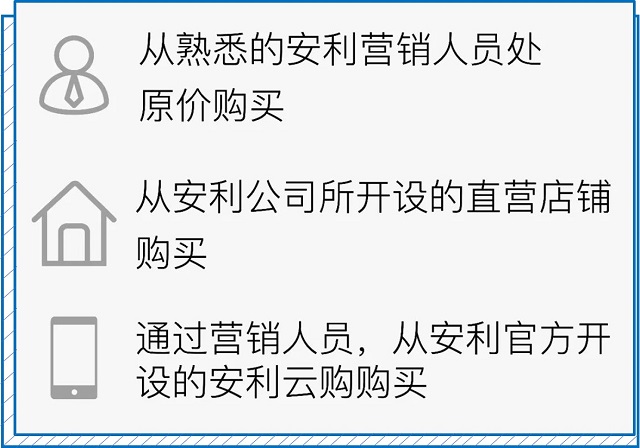 安利公司再次提醒广大消费者,为保证您的权益,请从以下正规渠道购买安利产品。购买正品100%质量有保证,还能享受30天退货保障和完善的售后服务。同时,安利产品严格执行统一标价销售政策,公司也严禁销售人员打折销售: