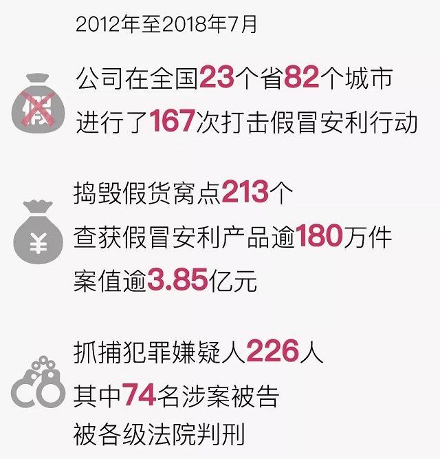 作为知名品牌,安利一直深受网络假货侵害。为了营造良好的市场秩序,切实保障消费者权益,公司对打击假货不遗余力: