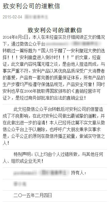 安利再度起诉传谣者,一微信号公开道歉4个月